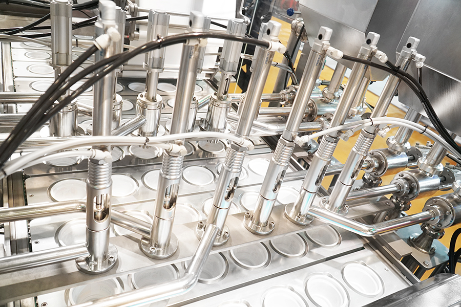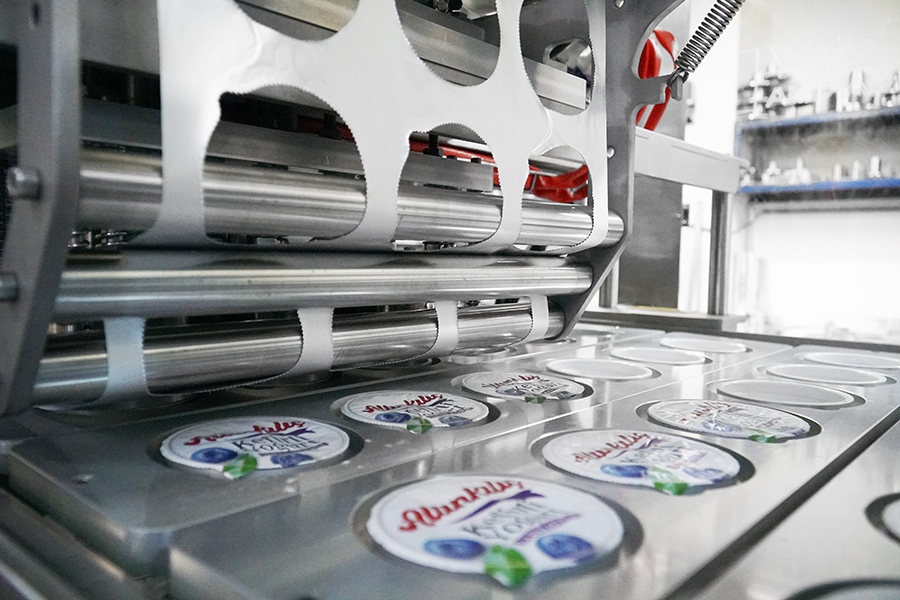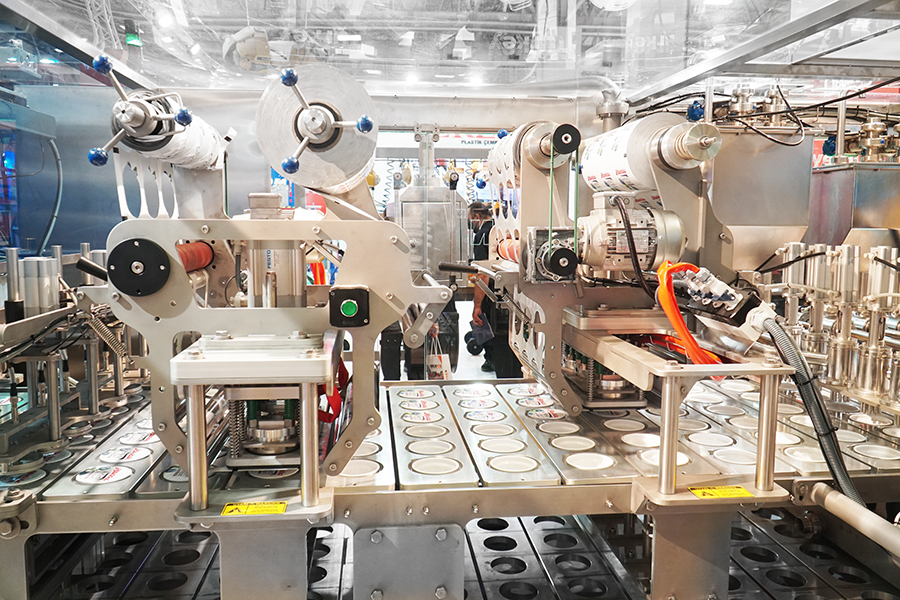 Once filled, the containers move to the foil sealing and capping station, where the foil is automatically cut and sealed onto each cup or jar. This ensures complete airtight protection and preserves product freshness.
